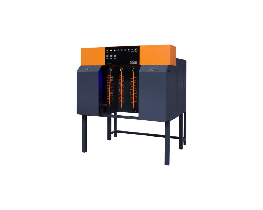 This machine cures 3D UV-coated products, with a conveyor ensuring all surfaces are fully exposed.